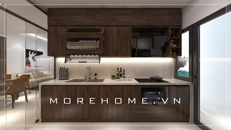 Thiết kế phòng bếp hiện đại với nội thất gỗ tự nhiên đơn giản nhưng vẫn đảm bảo tiện nghi cho các căn hộ chung cư.