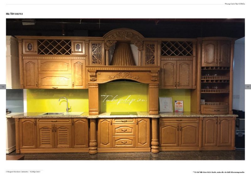 . Thiết kế tủ bếp cực kỳ ấn tượng với chất liệu cao cấp là gỗ tự nhiên được chạm khắc tỉ mỉ, đa dụng cho cuộc sống đẳng cấp của các gia chủ.
